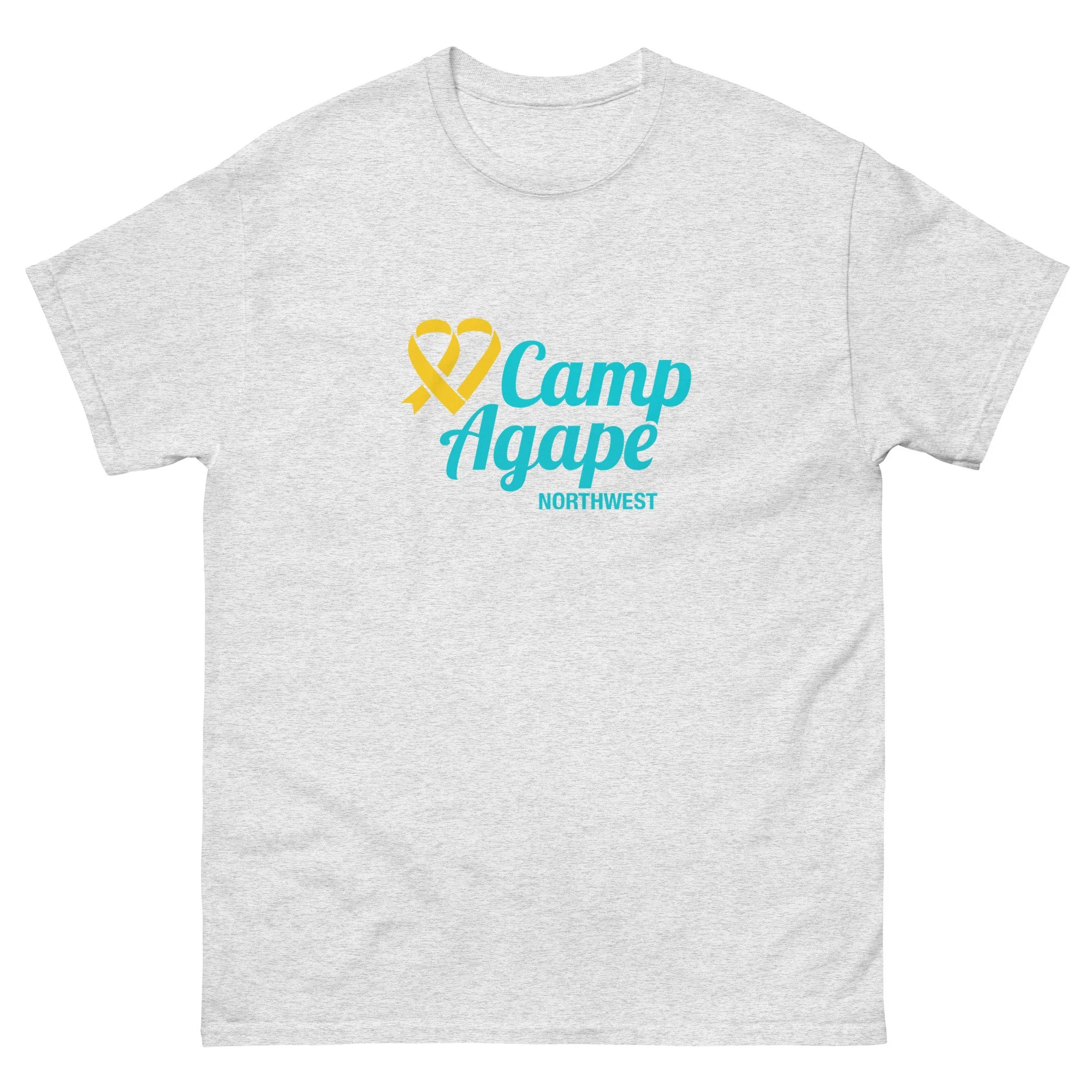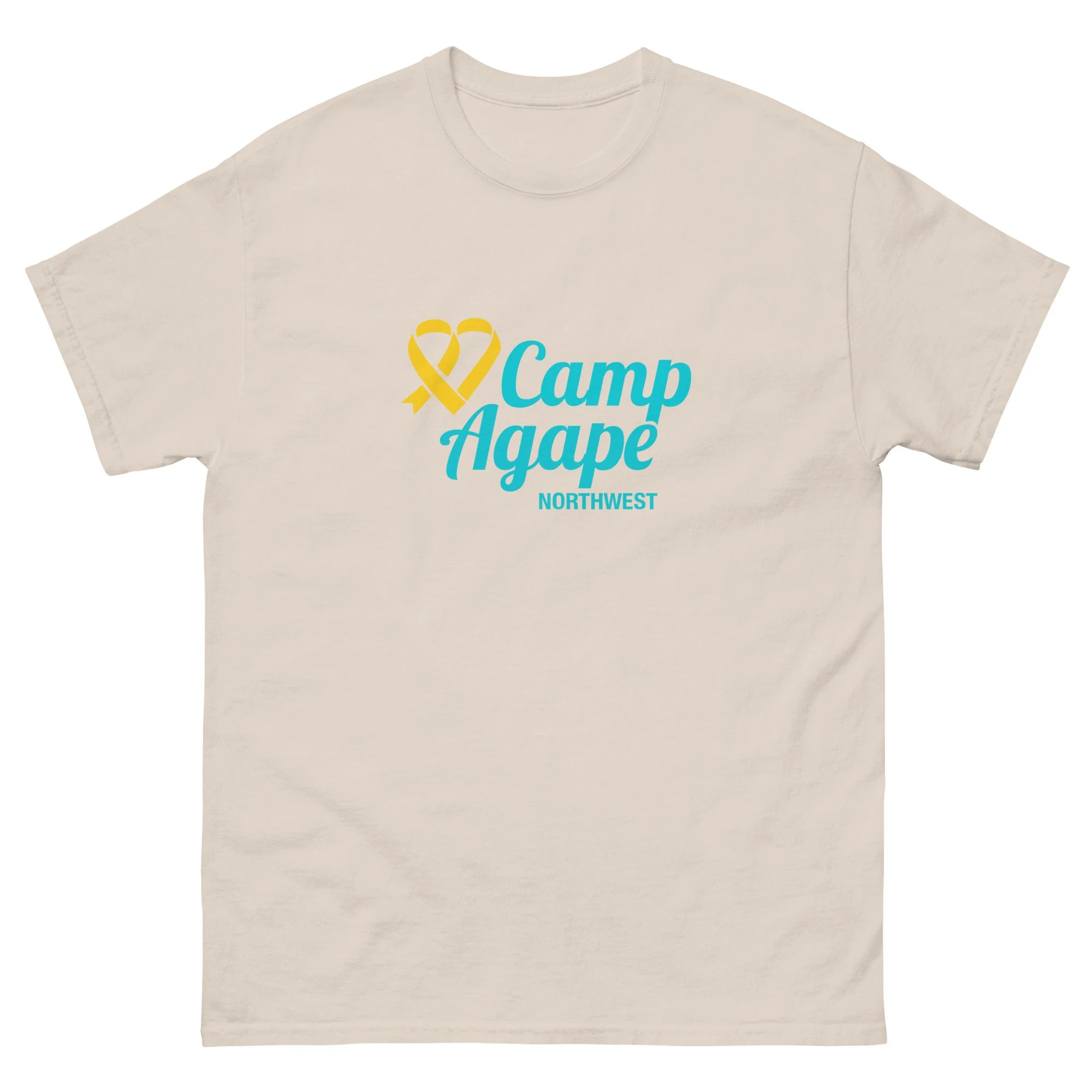 The gold ribbon forms our signature heart, a symbol of childhood cancer awareness and the strength of the families we serve. The vibrant blue reflects the optimism of a bright summer sky, full of possibility, joy, and healing moments at camp. Together, these colors tell our story: a place where courage and hope meet, and where every child and family is embraced with love. A portion of each sale goest directly to Camp Agape Northwest.